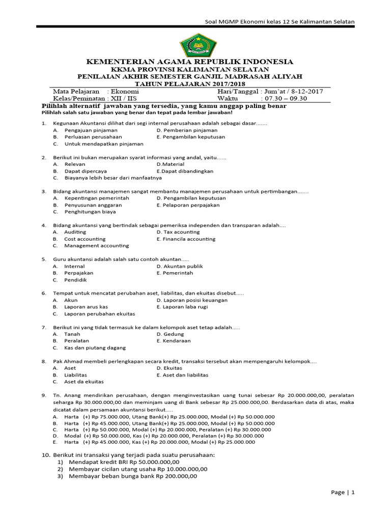 Soal-soal yang disajikan dalam artikel ini banyak membahas pencatatan akuntansi seperti jurnal, buku besar, laporan laba rugi, neraca, harga pokok penjualan, potongan dan retur, hingga siklus akuntansi yang menjadi dasar pengelolaan keuangan perusahaan. Artikel ini menyediakan kumpulan soal ujian Ekonomi untuk siswa kelas 12 SMA/SMK hingga MA. Terdapat 50 contoh soal ulangan yang dirangkum dalam artikel ini sebagai bahan belajar.