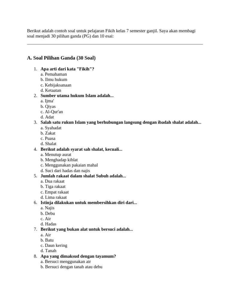 Artikel ini menyajikan kumpulan 50 soal latihan Penilaian Akhir Semester (PAS) atau Sumatif Akhir Semester (SAS) Fikih untuk siswa kelas 7 SMP semester 2 tahun 2026. Soal-soal ini disusun berdasarkan Kurikulum Merdeka dan dirancang untuk membantu siswa mempersiapkan diri menghadapi ujian dengan cara berlatih dan menguji pemahaman mereka terhadap materi yang telah dipelajari di sekolah.