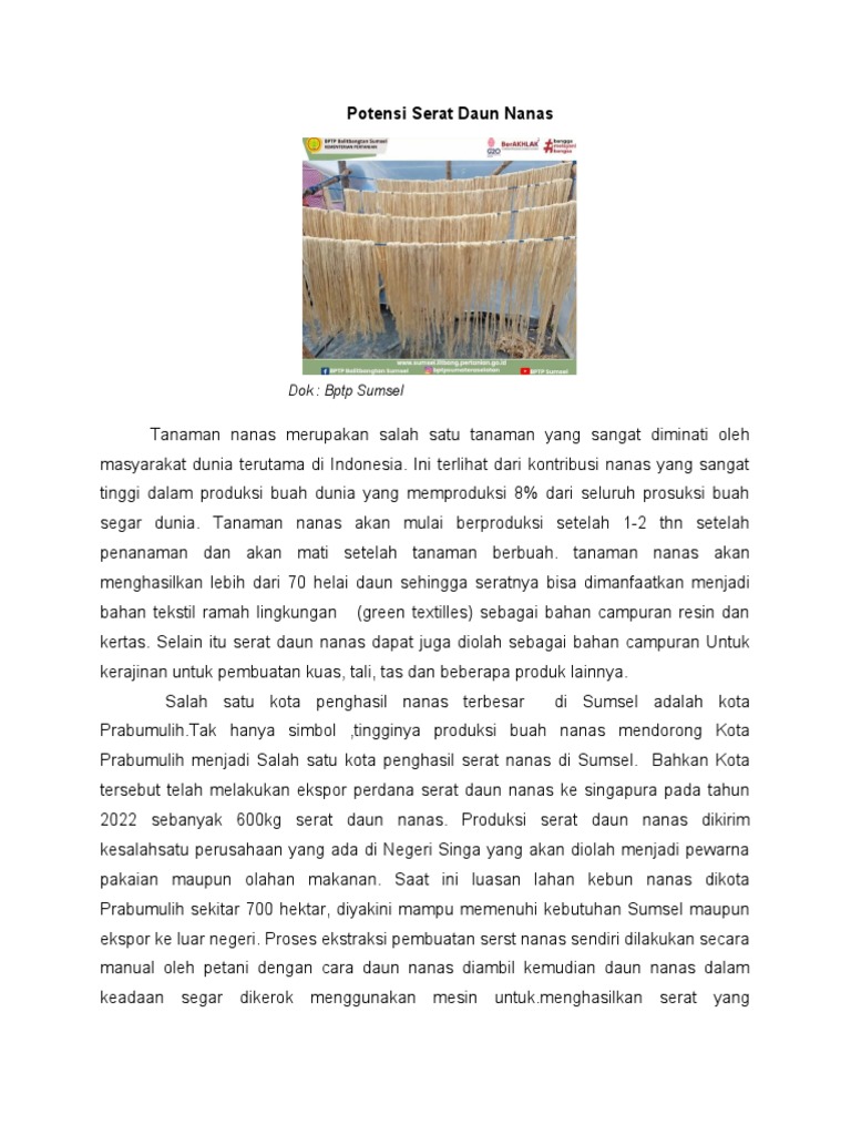 Indonesia memiliki potensi besar dalam penggunaan serat alam sebagai alternatif, seperti serat rami dan daun nanas. Keduanya tersedia melimpah sebagai hasil samping dari sektor pertanian. Produksi nanas nasional pada 2024 mencapai sekitar 3,15 juta ton, yang menghasilkan limbah daun nanas yang melimpah. Setiap 1 ton nanas segar bisa menghasilkan sekitar 100 kg limbah daun nanas, sehingga ada potensi 315.000 ton limbah daun per tahun.
