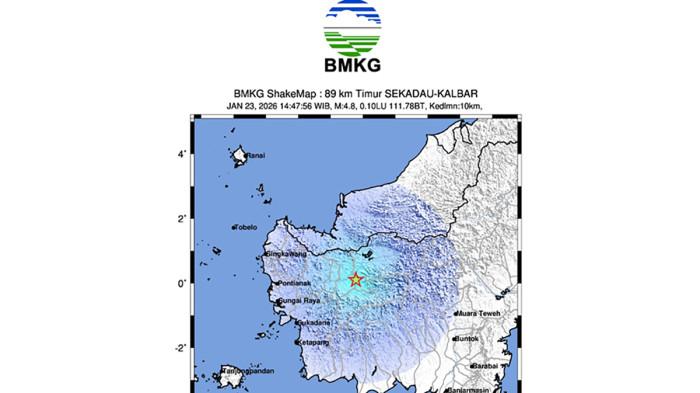 PONTIANAK – Gempa tektonik berkekuatan magnitudo 4,8 mengguncang wilayah Kabupaten Sekadau, Kalimantan Barat, pada Jumat, 23 Januari 2026, pukul 14.27.56 WIB. Berdasarkan hasil analisis terbaru Badan Meteorologi, Klimatologi, dan Geofisika (BMKG), episenter gempa berada pada koordinat 0,10° Lintang Utara dan 111,78° Bujur Timur. Lokasi gempa berada di darat, sekitar 89 kilometer timur Sekadau, dengan kedalaman 10 kilometer.