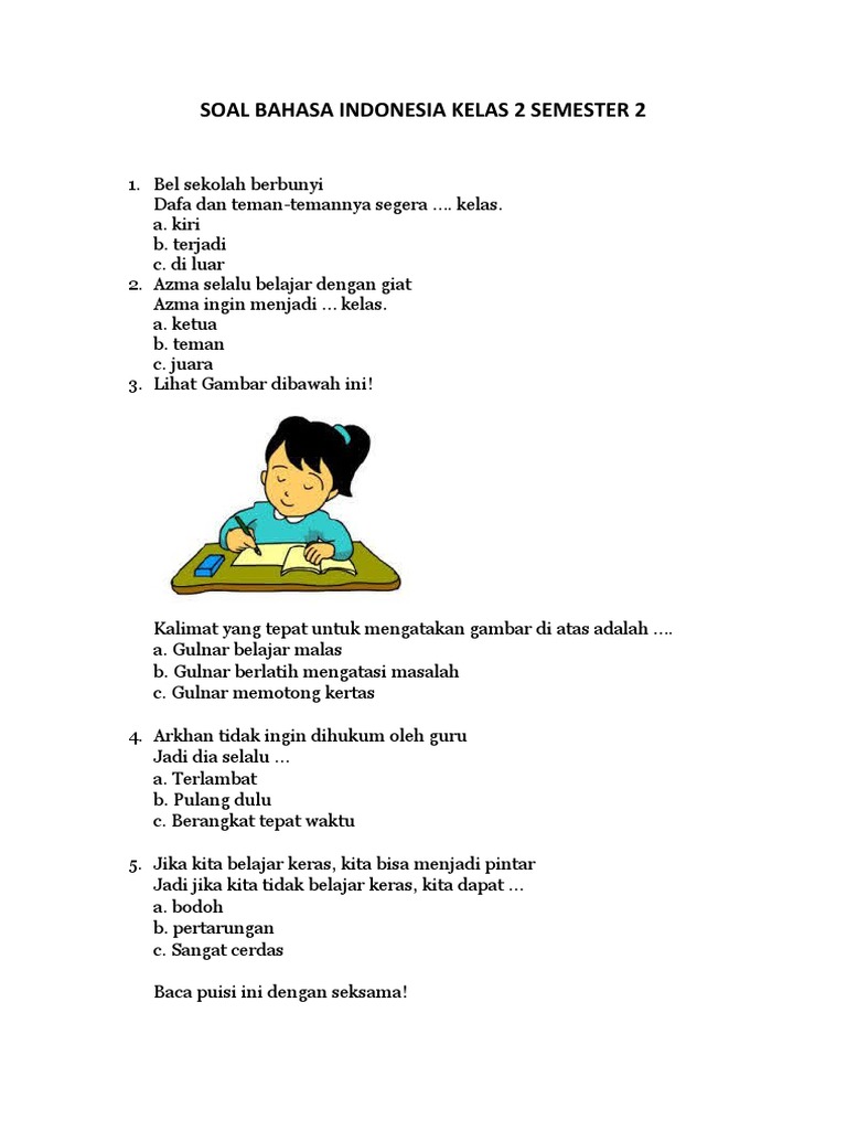 Latihan Soal PTS/STS Bahasa Indonesia Kelas 2 SD Semester 2 Tahun 2026