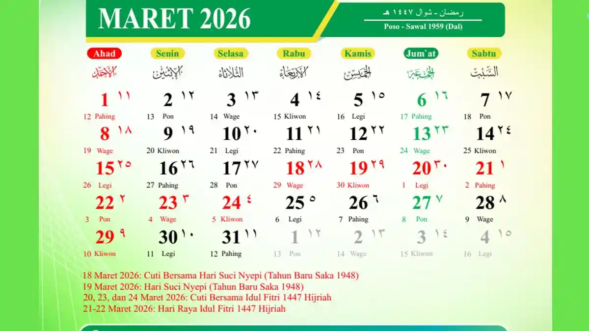 Berdasarkan Surat Keputusan Bersama (SKB) 3 Menteri tentang Libur Nasional dan Cuti Bersama, Hari Raya Nyepi jatuh pada tanggal 19 Maret 2026, sedangkan Cuti Bersama Hari Suci Nyepi dijadwalkan pada tanggal 18 Maret 2026. Sementara itu, perayaan Lebaran Idul Fitri 1447 H diperkirakan jatuh pada tanggal 21-22 Maret 2026. Libur Lebaran Idul Fitri 1447 H/2026 akan dimulai dari tanggal 20 Maret hingga 24 Maret 2026, dengan tanggal 20, 23, dan 24 Maret sebagai jadwal Cuti Bersama Lebaran.