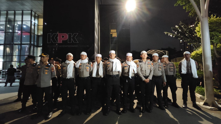 Sejumlah anggota polisi berjaga di depan Gedung Merah Putih KPK saat massa Banser berunjuk rasa terkait ditahannya Gus Yaqut. Pada Kamis, tampak ada beberapa polisi yang mengenakan sorban berwarna putih. Mereka juga mengenakan peci dengan warna senada. Para polisi itu berbaris di depan gerbang KPK untuk mengawal demo yang digelar massa Banser.